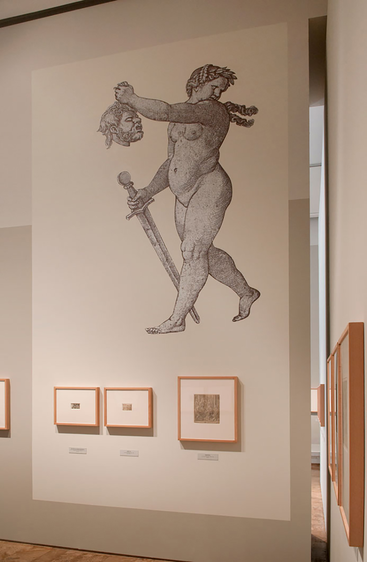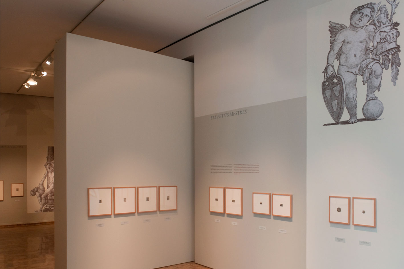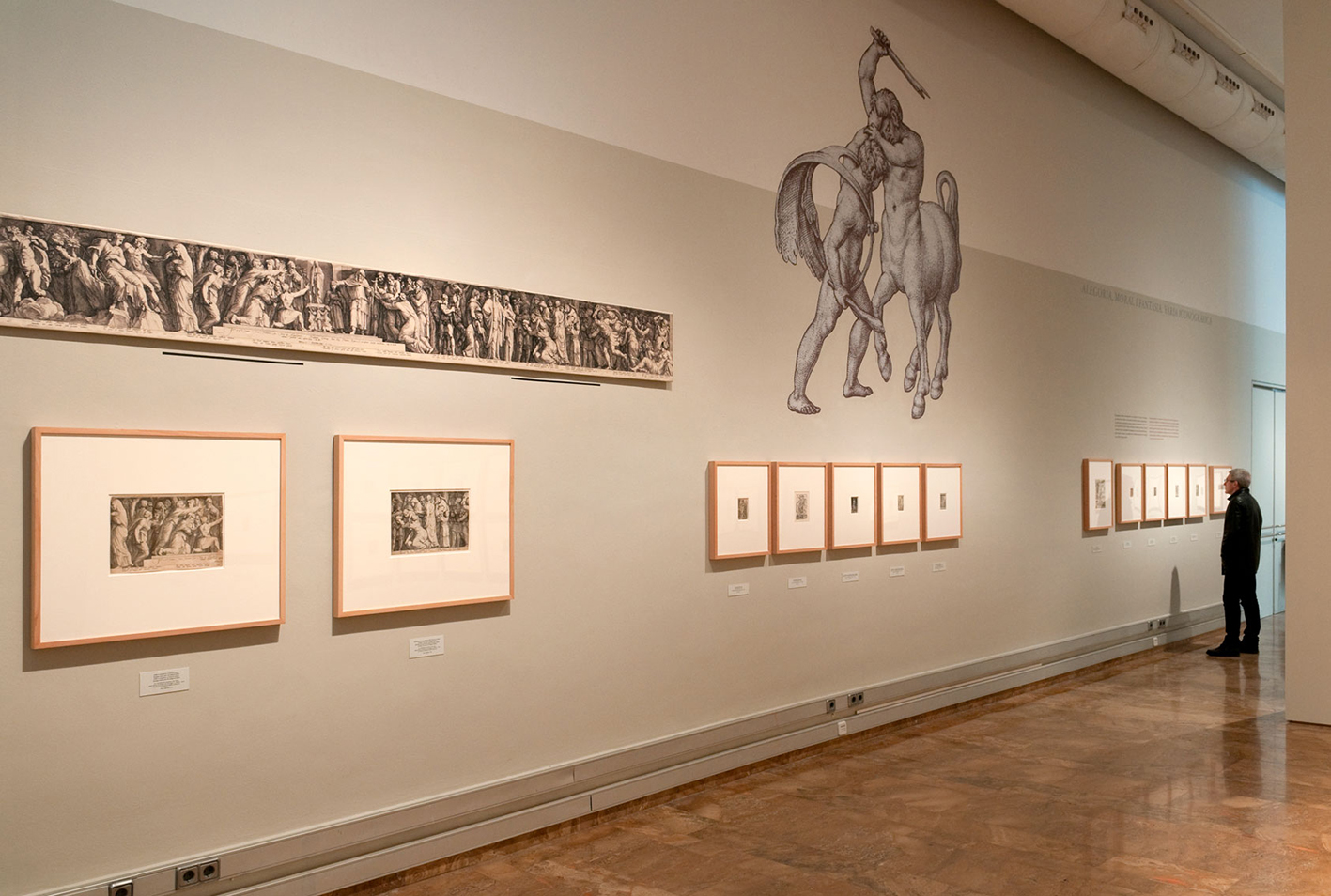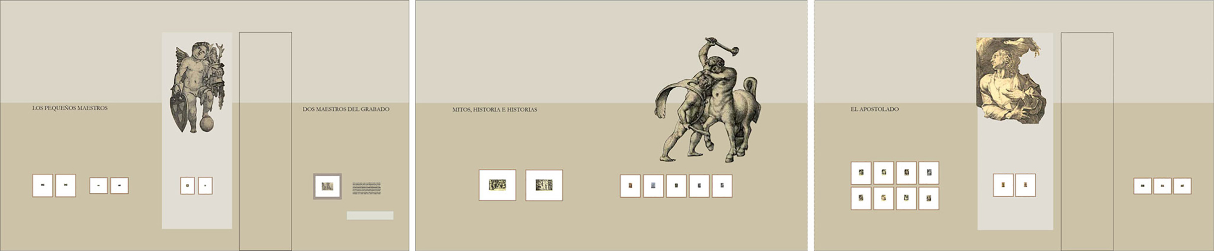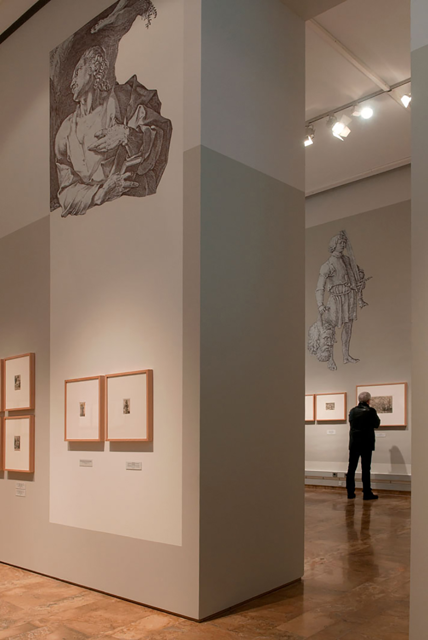 Figures taken from the prints themselves are incorporated with the graphic play of paint on the upper parts of the walls and which contrast the small size of the prints with the great height of the room, in the layout of the exhibition area.