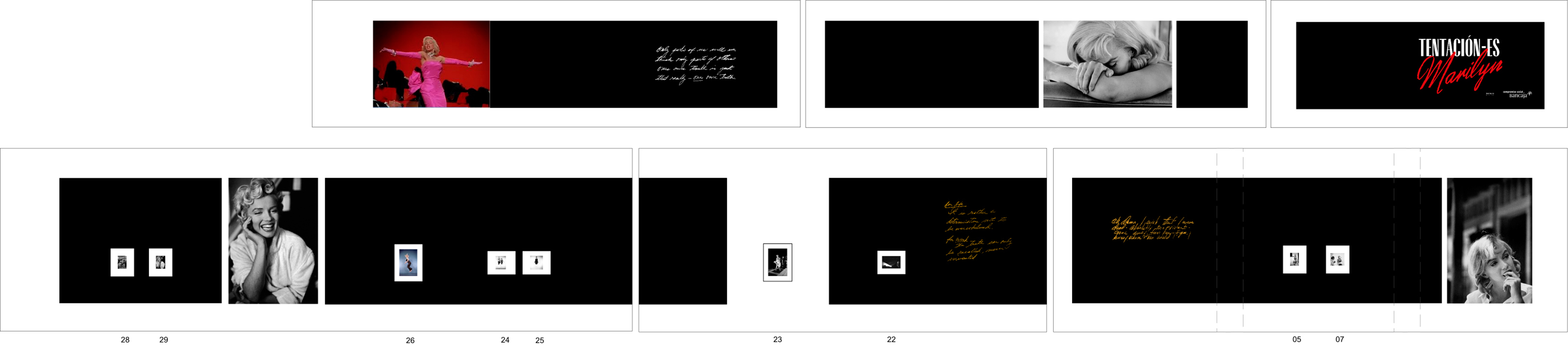 The original pictures are placed on a black band, as a frieze or film, which also contains the extended handwritten quotes taken from Marilyn´s diary or paragraphs from her memoirs. The frieze is interrupted occasionally with enlargements of photographs of the protagonist, at certain points in the room where the visitor's gaze has more visual distance. The overall composition, in black and white, strengthens the texture of the original photographic technique.