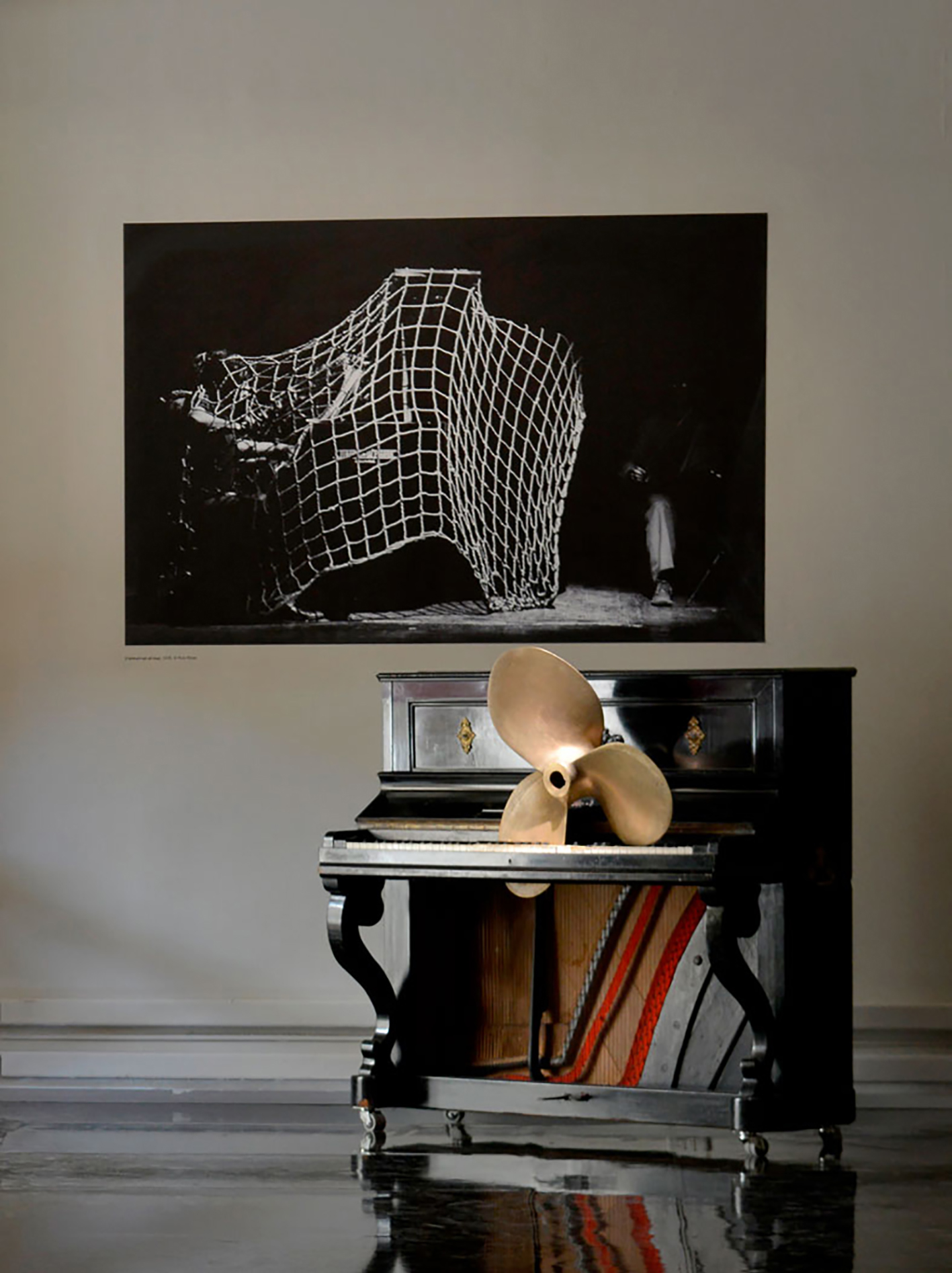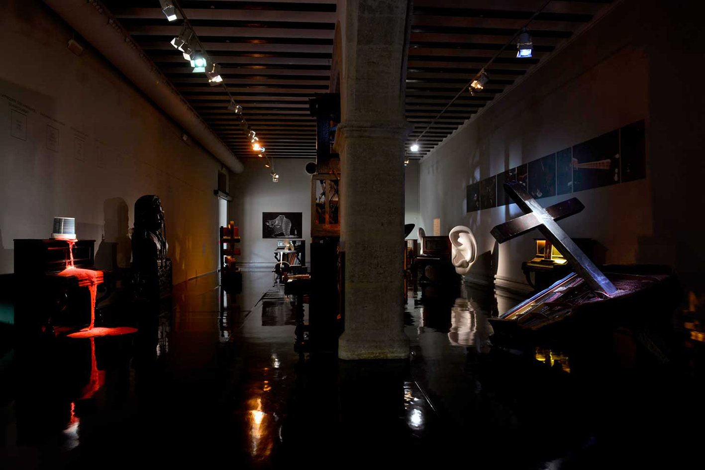 In the second hall, the musician´s “tampered pianos” are set up in an almost theatrical manner, reinforced by dramatic lighting and a shiny vinyl floor, achieving a breath-taking effect.