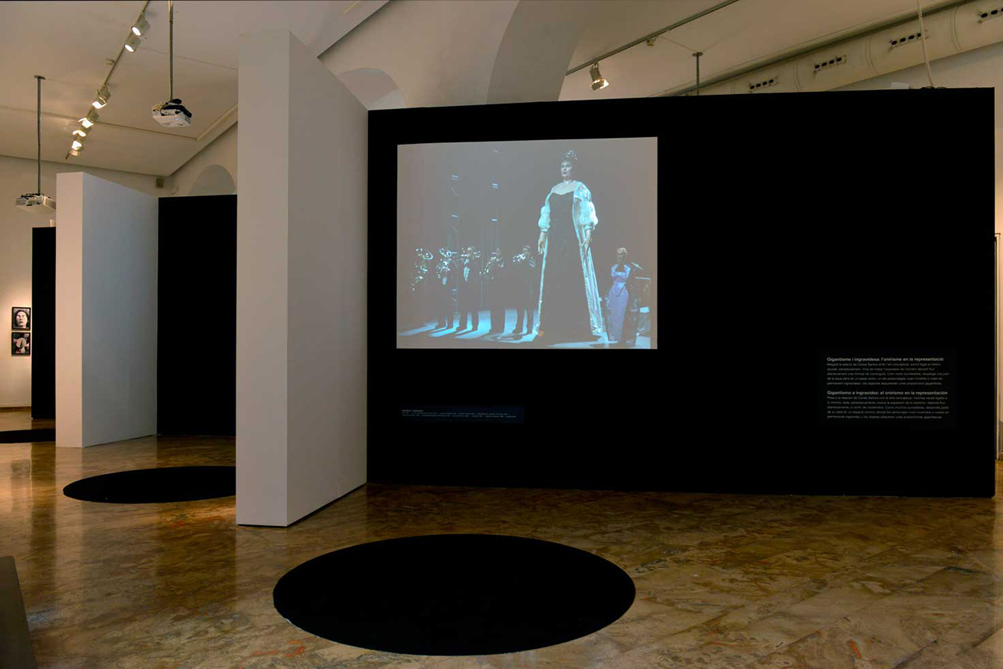 The exhibition is structured in two blocks which have been set up in the Estudi General and Acadèmia rooms of the La Nau Cultural Centre. In the first room, a composition of slanted walls builds five spaces with audio-visual projections, corresponding to key elements of Carles Santos´ work: The Piano; Water and the Sea; Sex and Religion; Gigantism and Weightlessness; Body and Food.