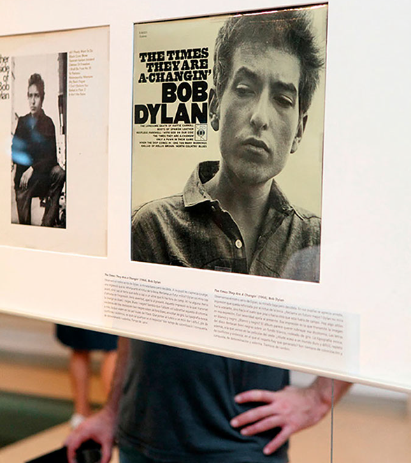 Tres grandes murales en las paredes longitudinales, junto a tres pantallas elevadas, relatan el discurso expositivo utilizando una técnica que nos remite a la publicidad y al pop.