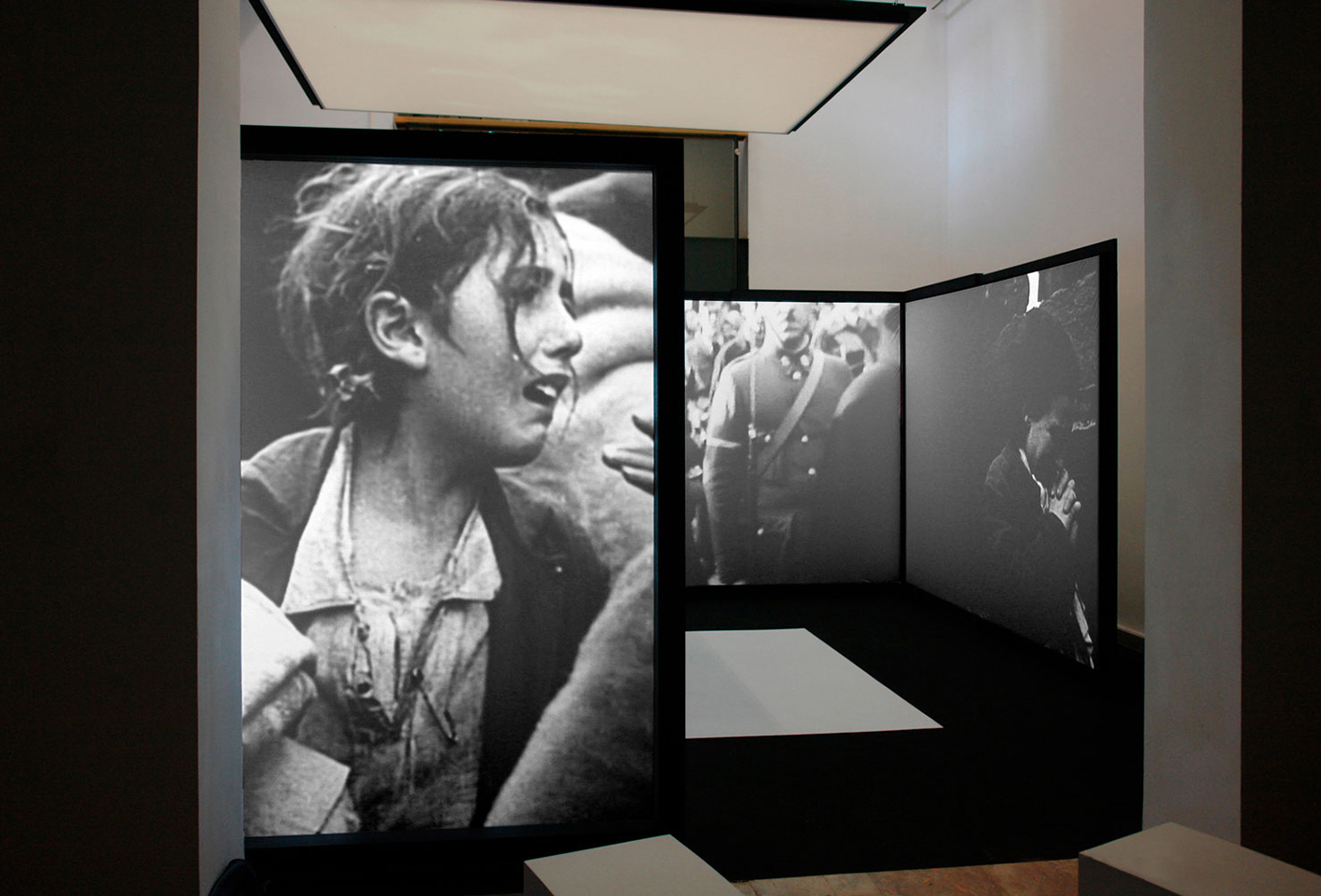 Una instalación de seis pantallas rodea al visitante con imágenes de la guerra, bombardeos, huidas y campos de refugiados, que lo sumergen y le hacen sentir el tránsito al exilio.