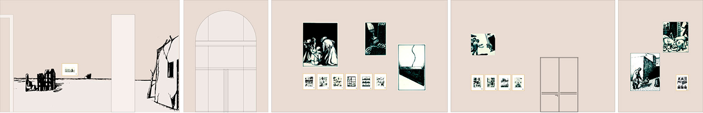En la primera sala de exposiciones, las paredes están formadas por dibujos enmarcados y viñetas que sugieren otras lecturas de las historias originales junto con las que están allí. También muestra un paisaje árido que nos introduce físicamente en uno de sus dibujos, transmitiendo la sensación de ruina y esterilidad a la visita.