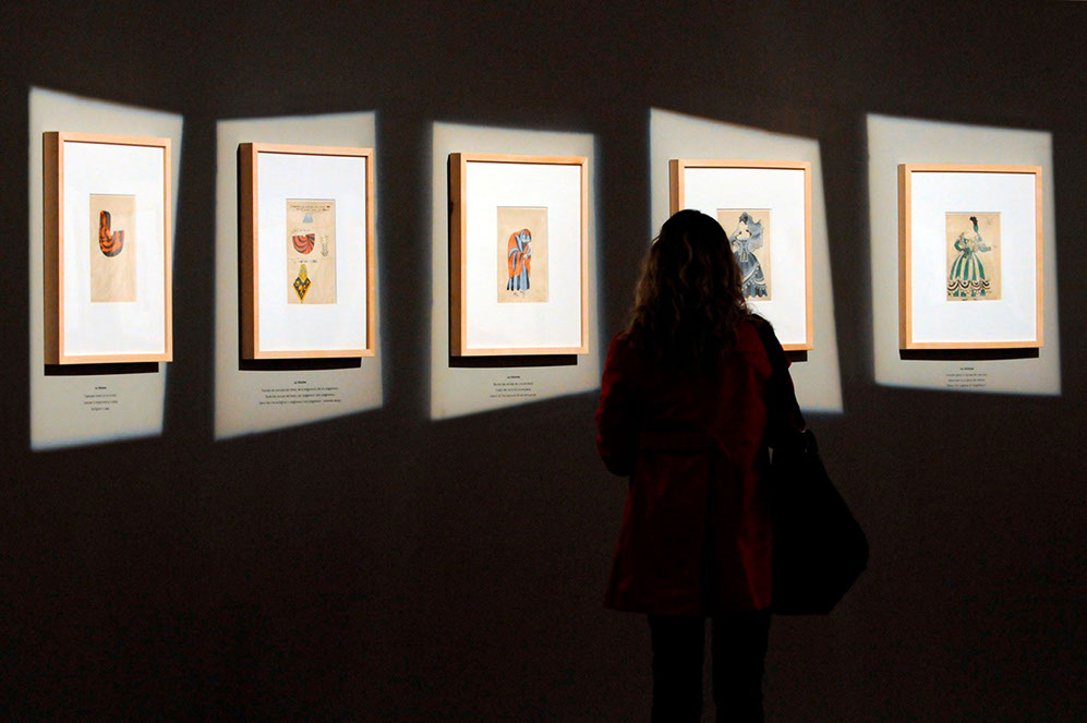 Las estampas con los treinta figurines del vestuario del ballet, se sitúan en un muro curvo con una iluminación muy ajustada y dinámica, en oposición a la gran pantalla donde se proyecta el ballet. La moqueta granate incide sobre la idea de teatro.