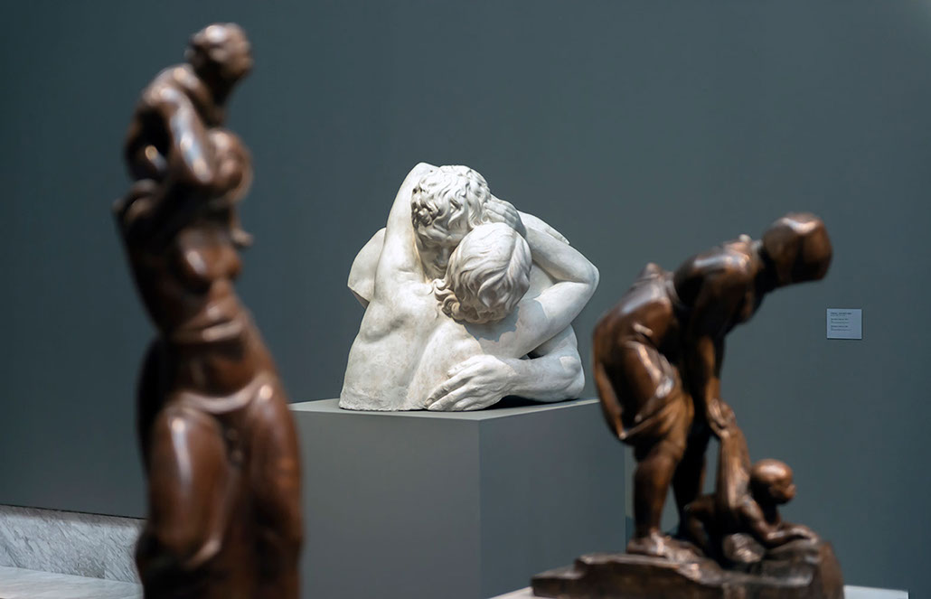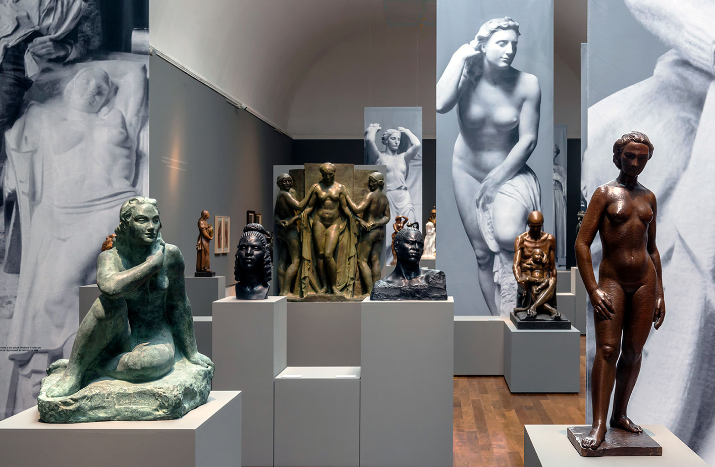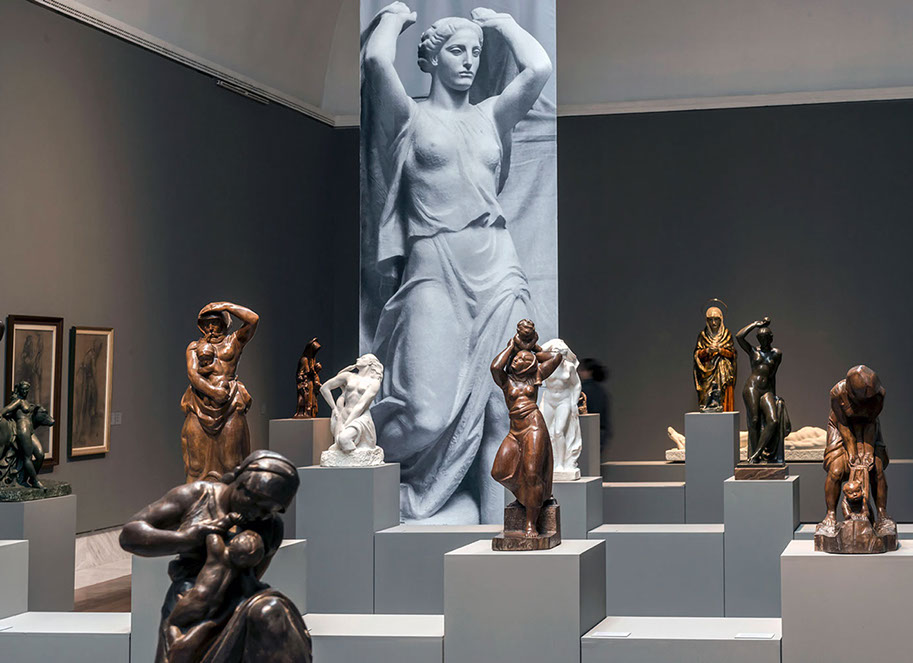 Las esculturas de los tres autores de muy diversos formatos se disponen en una serie de peanas alineadas y conectadas entre sí formando una sucesión de estructuras que organizan el espacio y la distribución cronológica y por autores de las piezas, permitiendo la ausencia de muros que compartimenten la sala. Seis bandas reproducen algunas esculturas perdidas de los artistas proponiendo un paisaje de piezas de gran formato como fondo y contraste de los originales dotando además de espectacularidad a la escenografía.