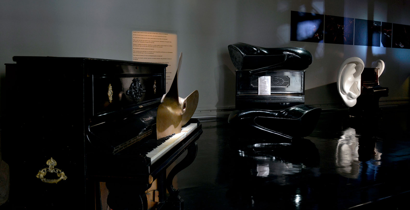 En la segunda sala, los “pianos intervenidos” por el músico, se distribuyen con un carácter teatral, reforzado por una iluminación dramática y el suelo de vinilo brillante, consiguiendo un efecto sobrecogedor.