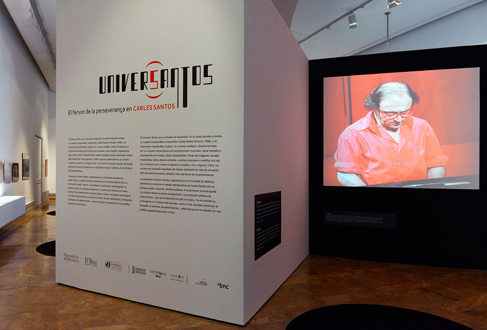 La exposición se estructura en dos bloques que coinciden con las salas Estudi General y Acadèmia del Centre Cultural la Nau. En la primera sala, una composición de muros oblicuos construye cinco espacios con proyecciones audiovisuales, correspondientes a elementos clave de la obra de Carles Santos: El Piano; El Agua y El Mar; El Sexo y la Religión; El Gigantismo y La Ingravidez; El Cuerpo y La Comida.