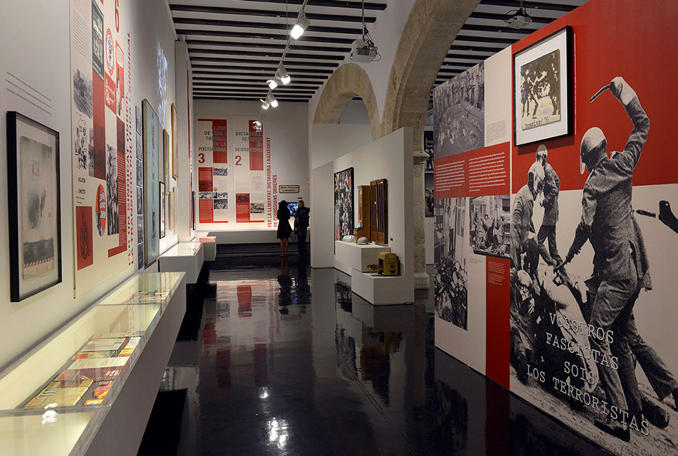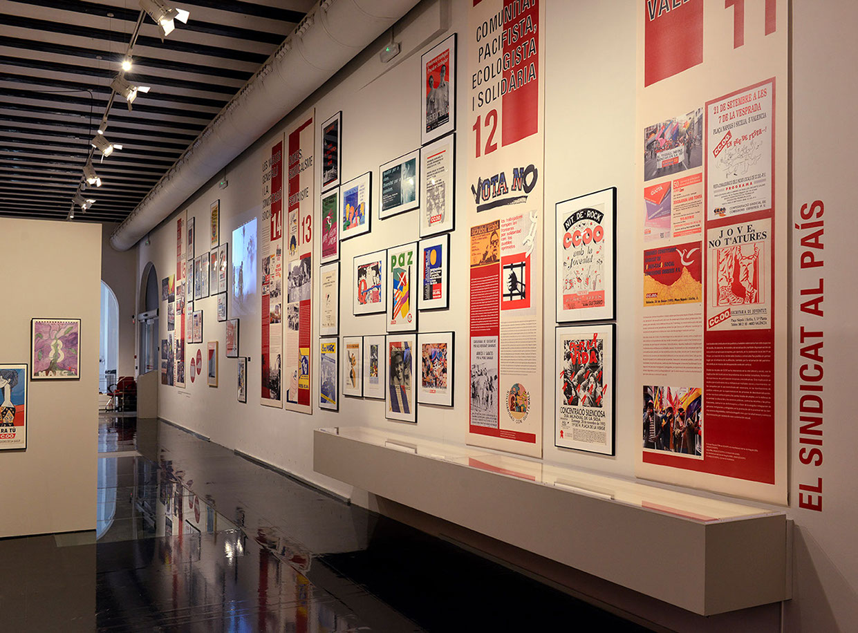 El diseño de la exposición es básicamente gráfico. La composición en las grandes paredes de la sala integra las piezas originales con los paneles gráficos que desglosan los contenidos, componiendo grandes murales que remiten a la cartelería en la calle, comunicación básica de los sindicatos o los movimientos sociales.