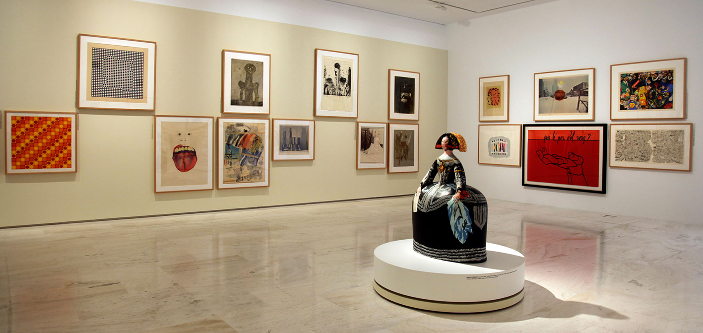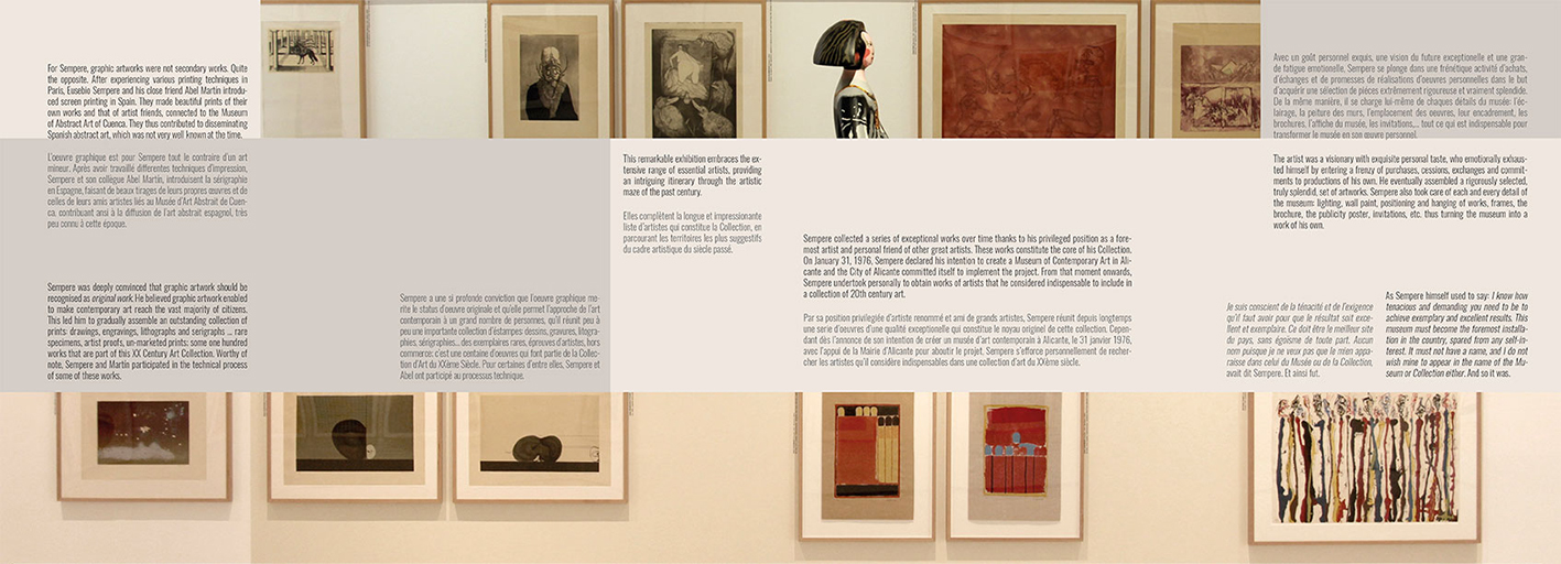 La dificultad del montaje era el reducido tamaño de la sala para acoger toda la obra. Se opta por no construir falsos muros que aumentaran la superficie de pared, y se realiza un trabajo de encaje de las obras, que consigue una potente composición mural que se puede apreciar desde cualquier punto de la sala.