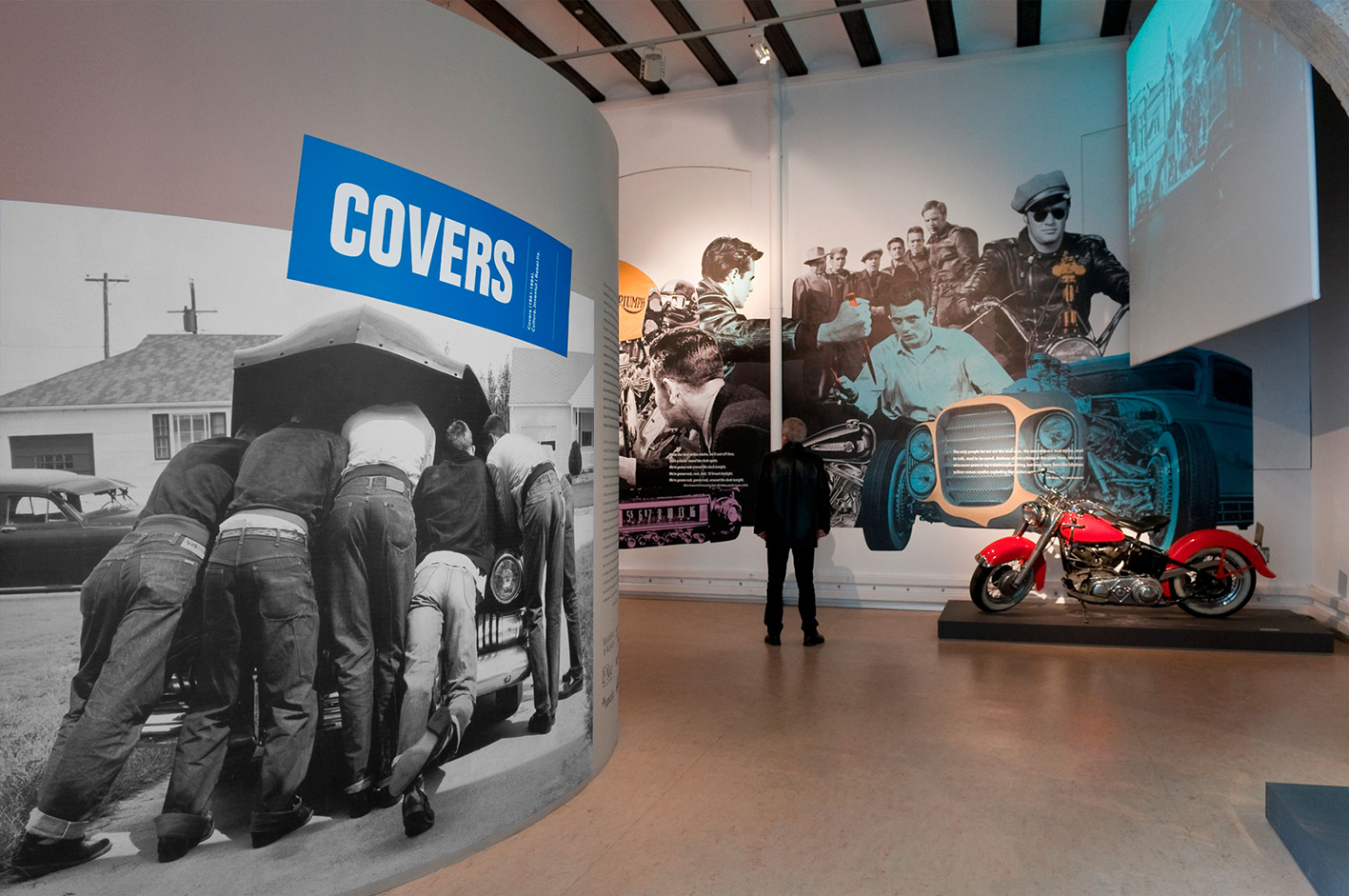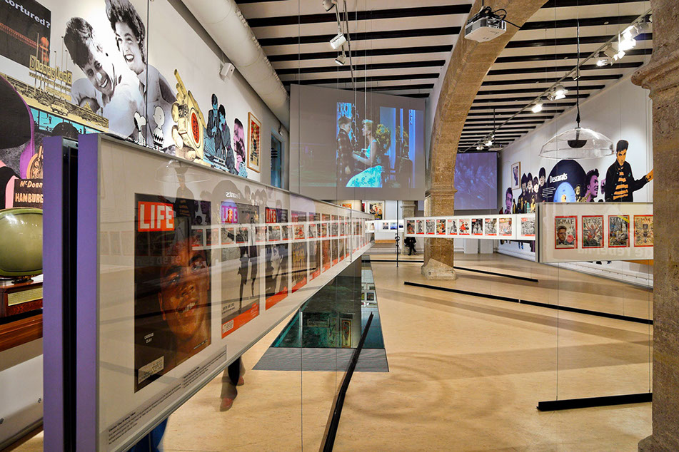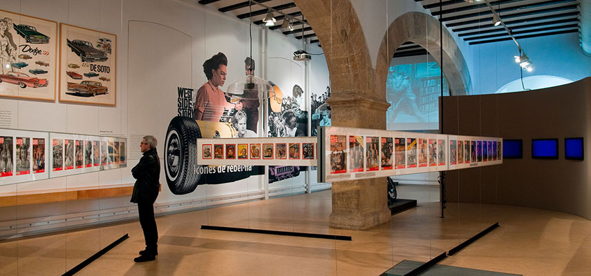 Tres grandes murales en las paredes longitudinales, junto a tres pantallas elevadas, relatan el discurso expositivo utilizando una técnica que nos remite a la publicidad y al pop.