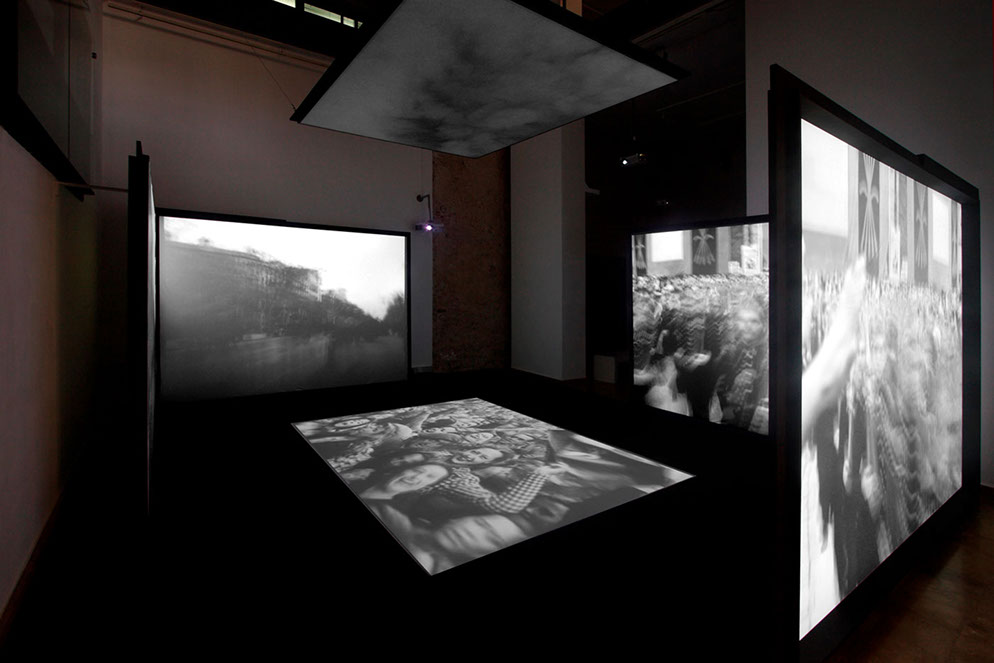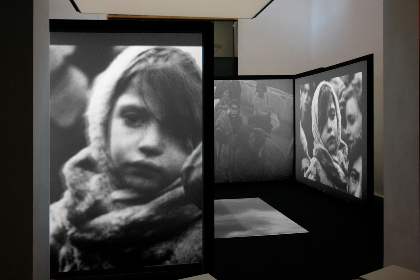 Una instalación de seis pantallas rodea al visitante con imágenes de la guerra, bombardeos, huidas y campos de refugiados, que lo sumergen y le hacen sentir el tránsito al exilio.