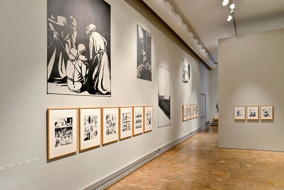 En la primera sala de exposiciones, las paredes están formadas por dibujos enmarcados y viñetas que sugieren otras lecturas de las historias originales junto con las que están allí. También muestra un paisaje árido que nos introduce físicamente en uno de sus dibujos, transmitiendo la sensación de ruina y esterilidad a la visita.