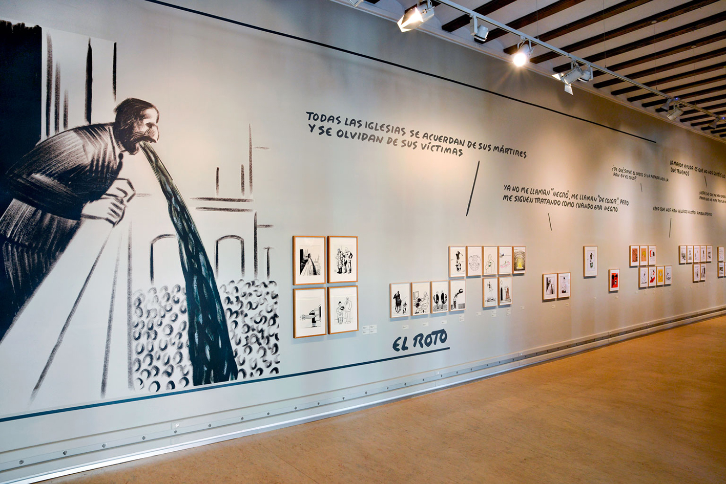 La sala elegida para El Roto reproduce y amplía los textos extraídos como mensajes poderosos que acabamos de completar cuando nos acercamos y vemos la viñeta.