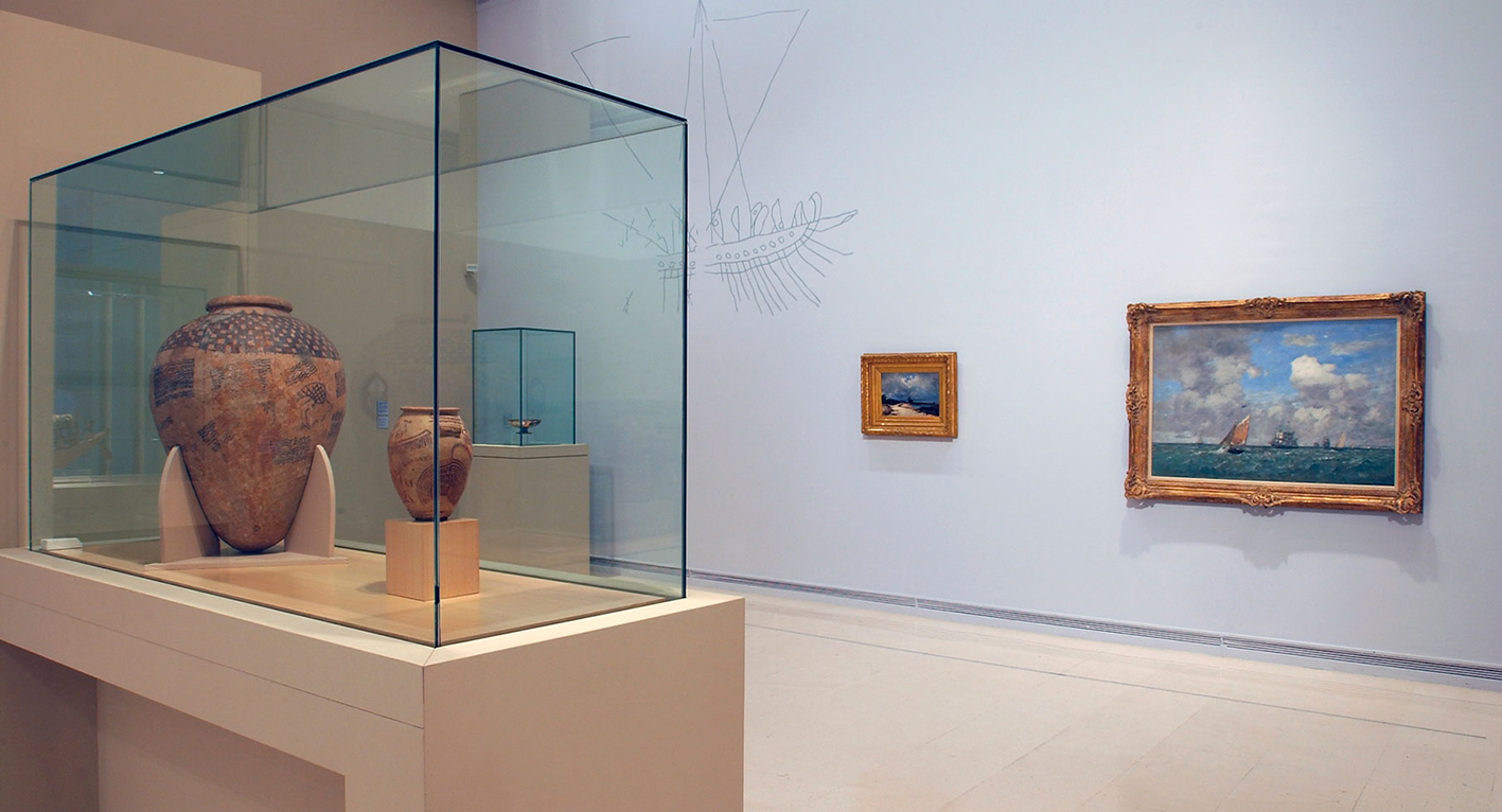 Junto a las piezas se dibujan, perfectamente integradas en las paredes, ilustraciones de perfiles de cascos de barco, una rosa de los vientos o antiguos dibujos encontrados en la muralla del Castillo de Denia.