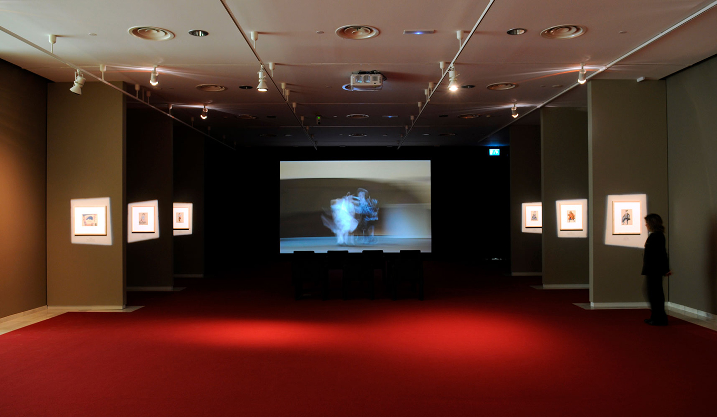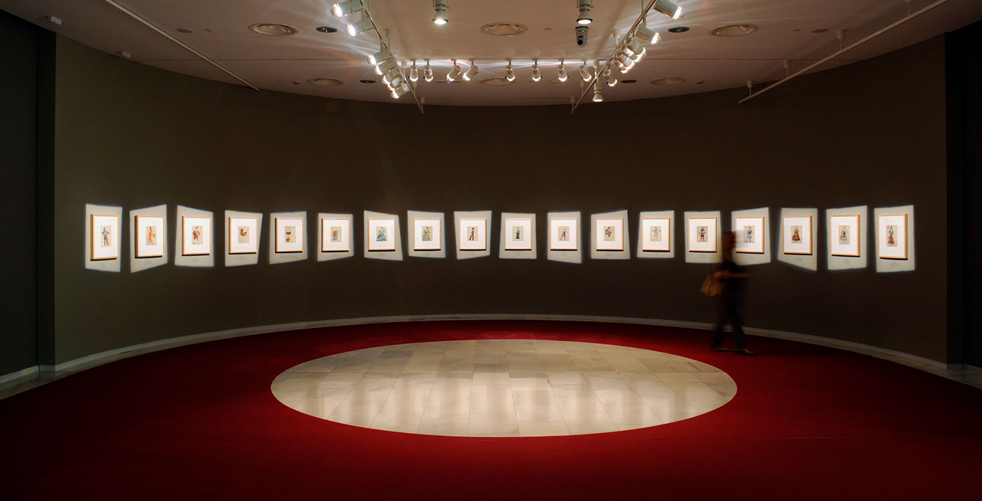 Las estampas con los treinta figurines del vestuario del ballet, se sitúan en un muro curvo con una iluminación muy ajustada y dinámica, en oposición a la gran pantalla donde se proyecta el ballet. La moqueta granate incide sobre la idea de teatro.