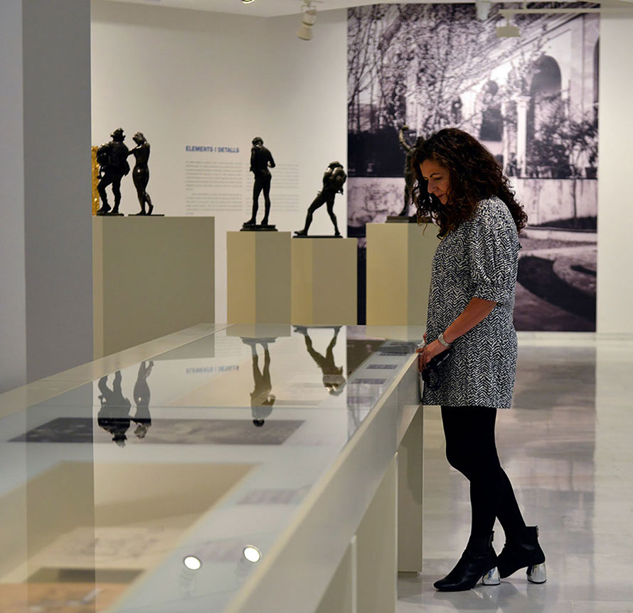 El color general de la sala, luminoso, se rompe con algunos fragmentos de azul que dividen los paños de pared aportando dinamismo al espacio. La ubicación de grandes imágenes del jardín en lugares estratégicos de las perspectivas de las salas produce la sensación de una apertura al exterior, como ventanas hacia el propio jardín. Y de un modo parecido funcionan los dos audiovisuales, que dan vida y movimiento a dos fotografías de la época, a la vez que se fusionan con bocetos y pinturas del pintor.