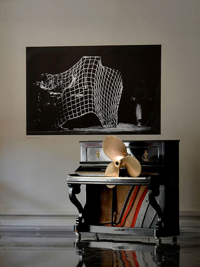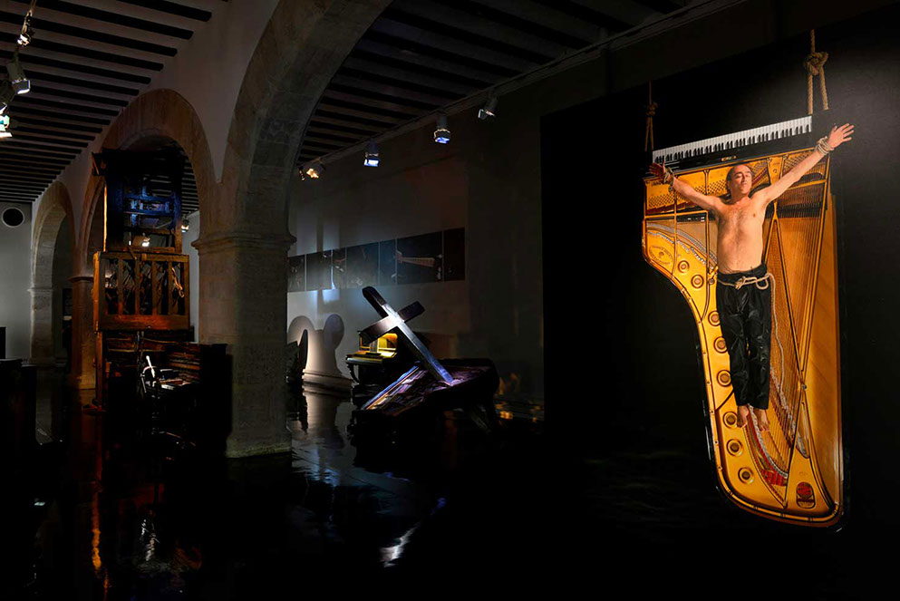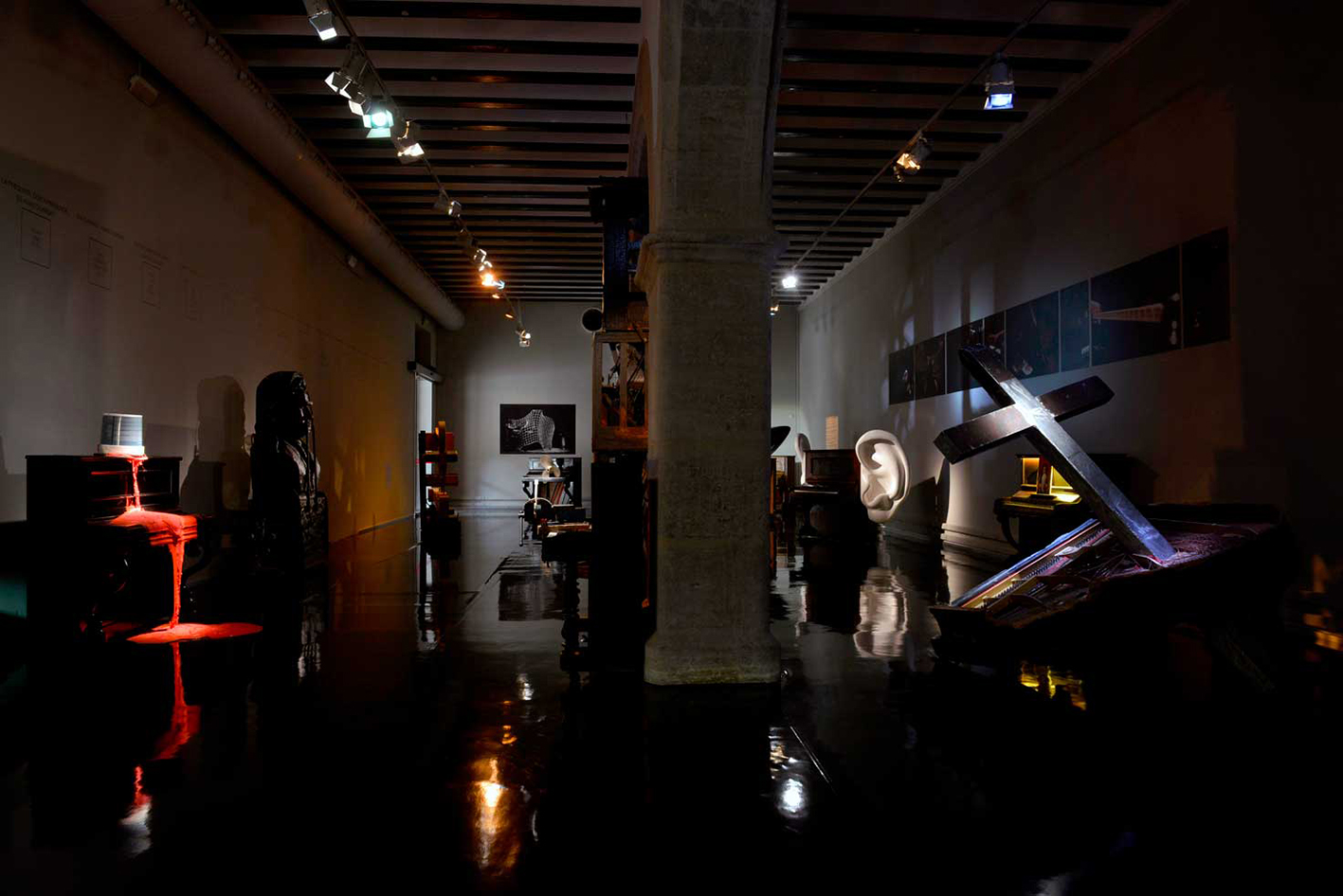 En la segunda sala, los “pianos intervenidos” por el músico, se distribuyen con un carácter teatral, reforzado por una iluminación dramática y el suelo de vinilo brillante, consiguiendo un efecto sobrecogedor.